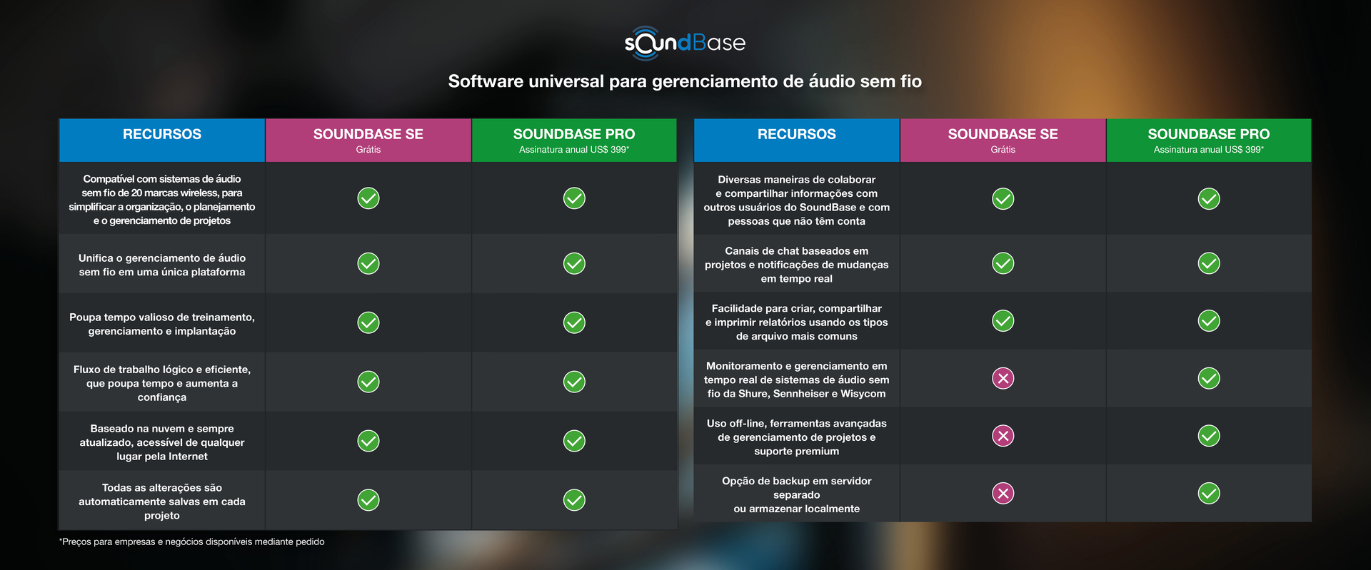 Desenvolvido por profissionais de áudio ao vivo para profissionais de áudio ao vivo, o SoundBase é um software que unifica seu fluxo de trabalho de áudio sem fio em uma plataforma única, simples e flexível. O SoundBase funciona de maneira perfeitamente integrada com sistemas da Shure, Sennheiser e Wisycom e tem o respaldo de uma comunidade dedicada, sendo constantemente atualizado com base no feedback do usuário. Obtenha o SoundBase SE gratuitamente ou escolha o SoundBase Pro para obter recursos ainda mais poderosos.
